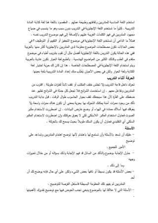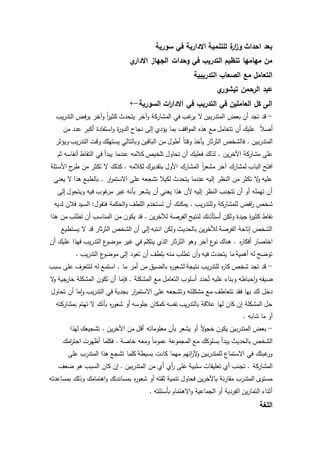 تناقش الوثيقة استراتيجيات فعالة للتعامل مع المتدربين خلال الدورات التدريبية في سورية، مع التركيز على كيفية إدارة صعوبات مثل عدم الرغبة في المشاركة أو التشويش من بعض المتدربين. تؤكد على أهمية التفاعل، استخدام اللغة المناسبة، وتشجيع المشاركة من خلال أساليب ترحب بآراء الجميع. تشدد أيضًا على ضرورة التطبيق العملي والتفاعل في التدريبات لضمان نجاح المتدربين في استخدام المهارات المكتسبة.
