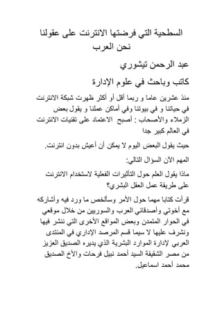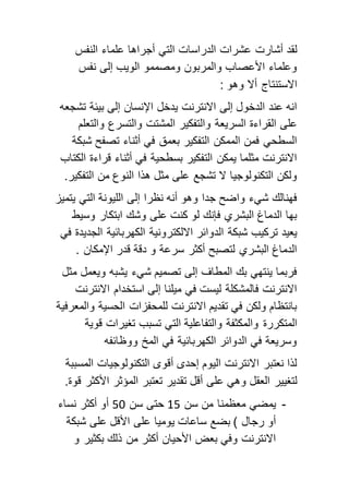 تتناول الوثيقة تأثير شبكة الإنترنت على الطريقة التي يعمل بها العقل البشري، حيث أظهرت الدراسات أن استخدام الإنترنت يعزز القراءة السريعة والتفكير السطحي. كما يناقش المقال فوائد وأضرار الإنترنت، داعياً إلى استخدامه بشكل إيجابي والتخطيط لاستراتيجية وطنية لتعزيز استخداماته في مجالات التعليم والإدارة. ويؤكد الكاتب على أهمية استغلال الكفاءات البشرية لتعزيز التنمية الرقمية في سوريا.
