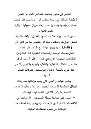 يتناول البرنامج الوطني للإصلاح الإداري في سوريا أهمية تحسين الهيكل التنظيمي للدولة لتعزيز فعالية الإدارة العامة، مع التركيز على إدماج القطاع الخاص وتبسيط الإجراءات الحكومية. يقترح البرنامج إعادة تنظيم الوزارات وتحسين الكفاءة من خلال تخفيض عددها وتفعيل دور الإدارة المحلية، بالإضافة إلى معالجة التداخل في الاختصاصات. كما يتضمن إصلاح هيكل الرواتب والأجور لضمان العدالة وتحفيز الأداء بين العاملين.