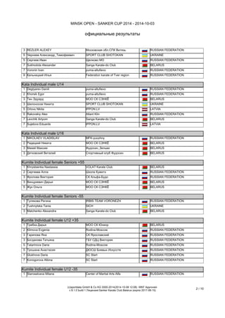 В документе представлены официальные результаты турнира по каратэ Minsk Open - Sanker Cup 2014, состоявшегося 3 октября 2014 года. Указаны категории соревнований для женщин и мужчин разных возрастов и весовых категорий, а также участники и их результаты. Результаты включают данные о спортсменах из Беларуси и других стран, таких как Россия, Украина и Латвия.