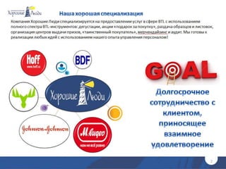 Компания 'Хорошие люди' предлагает широкий спектр услуг в области мерчендайзинга, торгового маркетинга и организации мероприятий, достигнув значительного успеха с момента своего основания в 2003 году. С течением времени компания заняла лидирующие позиции на рынке, с более чем 2000 успешно реализованными проектами и обширной базой полевых сотрудников. В их предложениях также присутствуют программы лояльности, аутсорсинг и создание рекламных материалов, что позволяет клиентам получать комплексные решения для бизнеса.