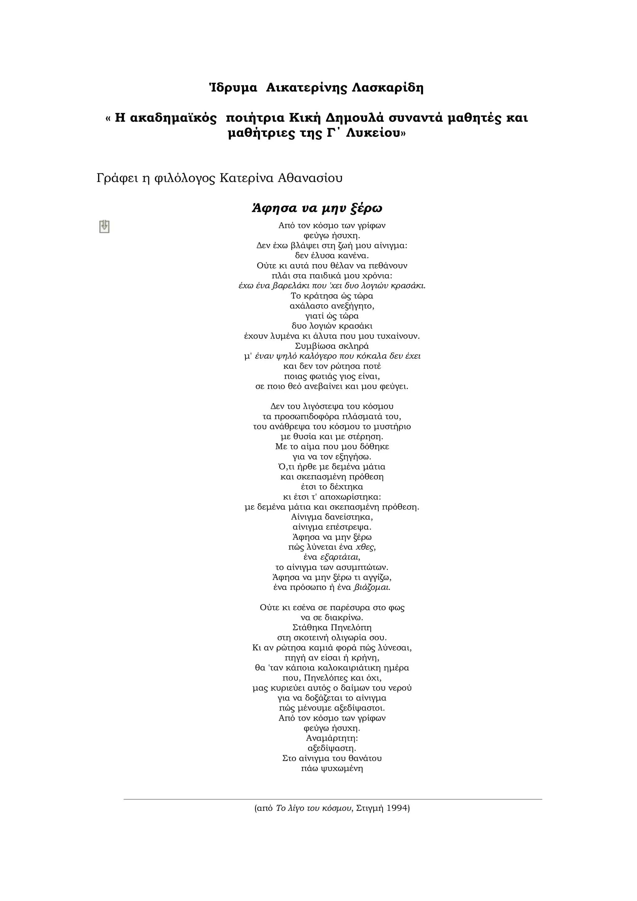 «Άφησα να μηνξέρω» είναι ο καλύτερος στίχος της, είπε σ’όλους και όλες εμάς του μαθήματος της Λογοτεχνίας της Θεωρητικής Κατεύθυνσης, την Τετάρτη 19 Φεβρουαρίου, η ποιήτρια Κική Δημουλά στη γνωριμία που είχε μαζί μας στα πλαίσια εκπαιδευτικού προγράμματος στο Ίδρυμα Λασκαρίδη στον Πειραιά.