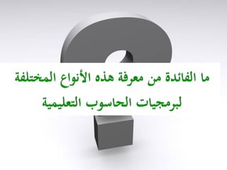 تتناول الوثيقة استخدام برامج التعليم المعتمدة على الحاسوب التي تهدف إلى تحسين تجربة التعلم من خلال دمج الوسائط المتعددة مثل النصوص، الرسوم، والفيديو. كما توضح الوثيقة أنواع البرامج التعليمية وتطبيقاتها، مع التركيز على أهمية تصميم العروض التعليمية بشكل جذاب وفعال لتحفيز التفاعل وتسهيل الفهم. تقدم الوثيقة أمثلة على أدوات التأليف البرمجية المستخدمة في التعليم، مثل PowerPoint وAuthorware.