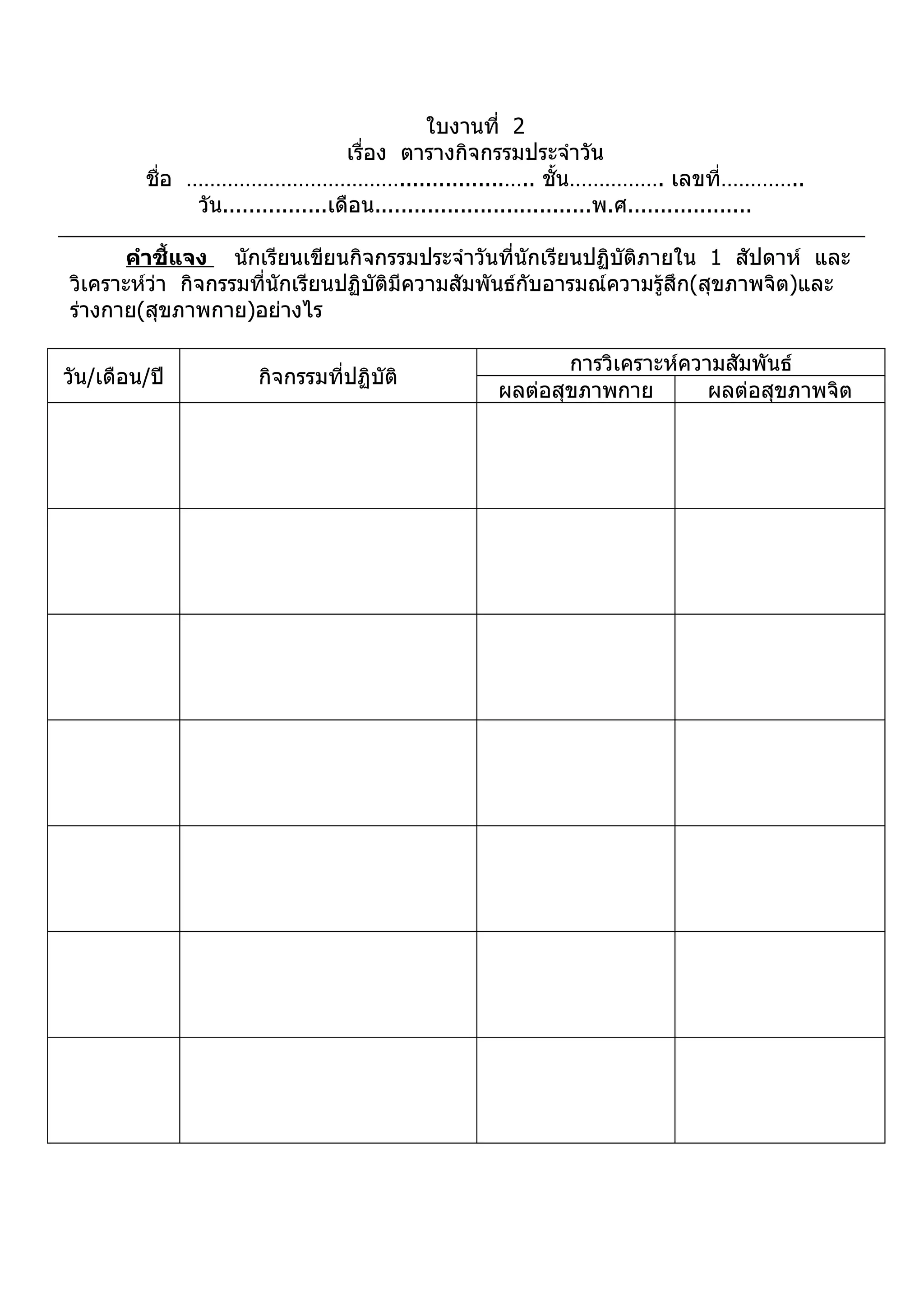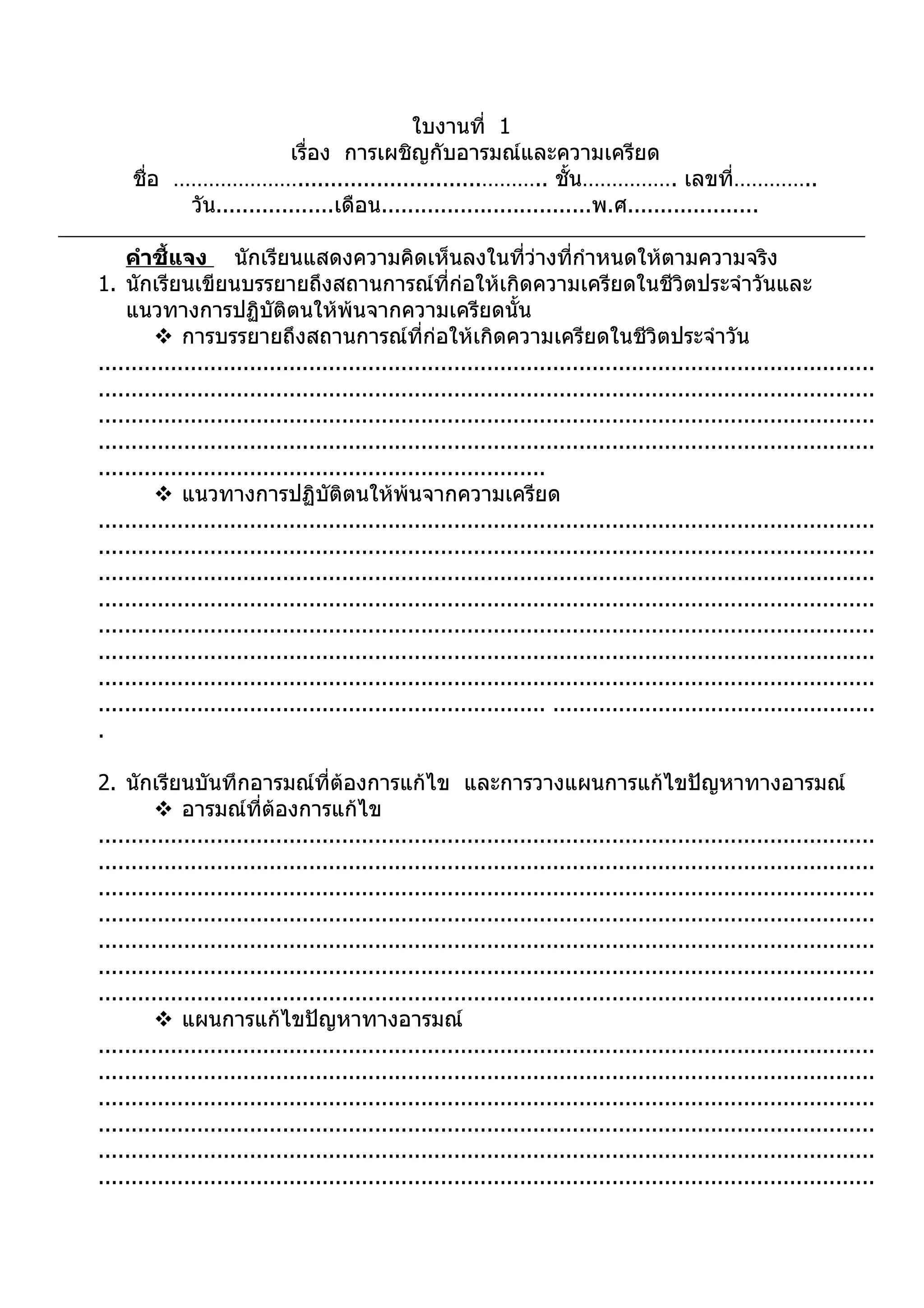 1. นักเรียนเขียนบรรยายถึงสถานการณ์ที่ก่อให้เกิดความเครียดในชีวิตประจำาวันและ