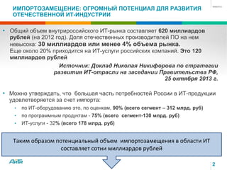 Документ рассматривает потенциал и стратегии импортозамещения в российской IT-индустрии, подчеркивая значительные объемы потребления иностранных IT-продуктов. Основные возможности включают развитие внутреннего производства и технологии, однако также выделены серьезные ограничения, такие как нехватка квалифицированных специалистов и финансовых ресурсов. Успешная реализация импортозамещения требует целостного подхода, включая поддержку госзакупок и долгосрочные программы для создания критически важных технологий.