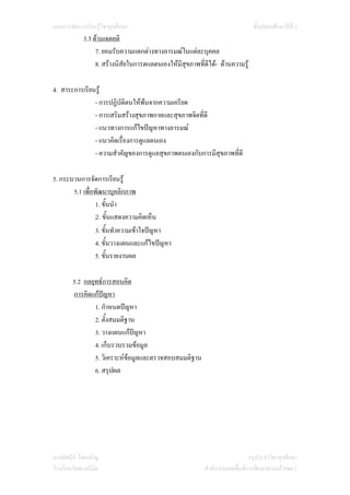 ชั้นมัธยมศึกษาปที่ 3 3.3 ดานเจตคติ 7. ยอมรับความแตกตางทางอารมณในแตละบุคคล 8. สรางนิสัยในการดแลตนเองใหมีสุขภาพที่ดีได- ดานความรู 4. สาระการเรียนรู - การปฏิบัติตนใหพนจากความเครียด - การเสริมสรางสุขภาพกายและสุขภาพจิตที่ดี - แนวทางการแกไขปญหาทางอารมณ - แนวคิดเรื่องการดูแลตนเอง - ความสําคัญของการดูแลสุขภาพตนเองกับการมีสุขภาพที่ดี 5. กระบวนการจัดการเรียนรู 5.1 เพื่อพัฒนาบุคลิกภาพ 1. ขั้นนํา 2. ขั้นแสดงความคิดเห็น 3. ขั้นทําความเขาใจปญหา 4. ขั้นวางแผนและแกไขปญหา 5. ขั้นรายงานผล 5.2 กลยุทธการสอนคิด การคิดแกปญหา 1. กําหนดปญหา 2. ตั้งสมมติฐาน 3. วางแผนแกปญหา 4. เก็บรวบรวมขอมูล 5. วิเคราะหขอมูลและตรวจสอบสมมติฐาน 6. สรุปผล นางทัศนีย ไชยเจริญ ครูประจําวิชาสุขศึกษา โรงเรียนวัดพวงนิมิต สํานักงานเขตพื้นที่การศึกษาสระแกวเขต 1