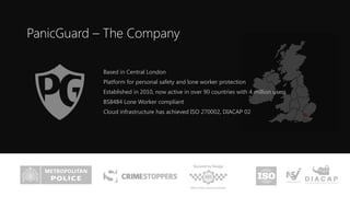 This document discusses PanicGuard, a company that provides a mobile platform for personal safety and lone worker protection. Some key points: