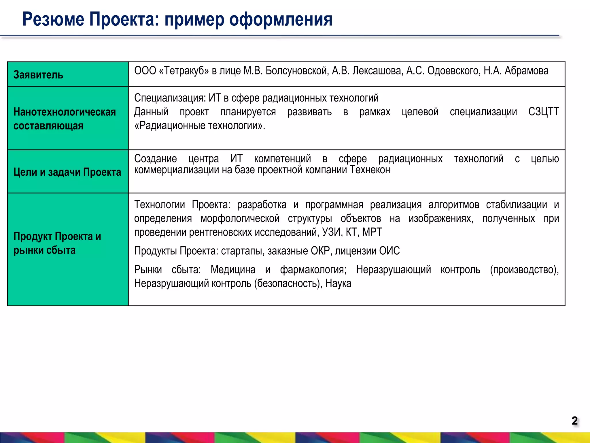 Документ описывает проект компании ООО «Технекон», направленный на создание центра ИТ-компетенций в сфере радиационных технологий, с акцентом на разработку программного обеспечения для обработки медицинских изображений. Участники проекта включают ООО «Тетракуб» и научно-исследовательские институты, которые обеспечивают поддержку, финансирование и необходимые ресурсы. Основные области применения технологий охватывают медицину, фармакологию, неразрушающий контроль и научные исследования.