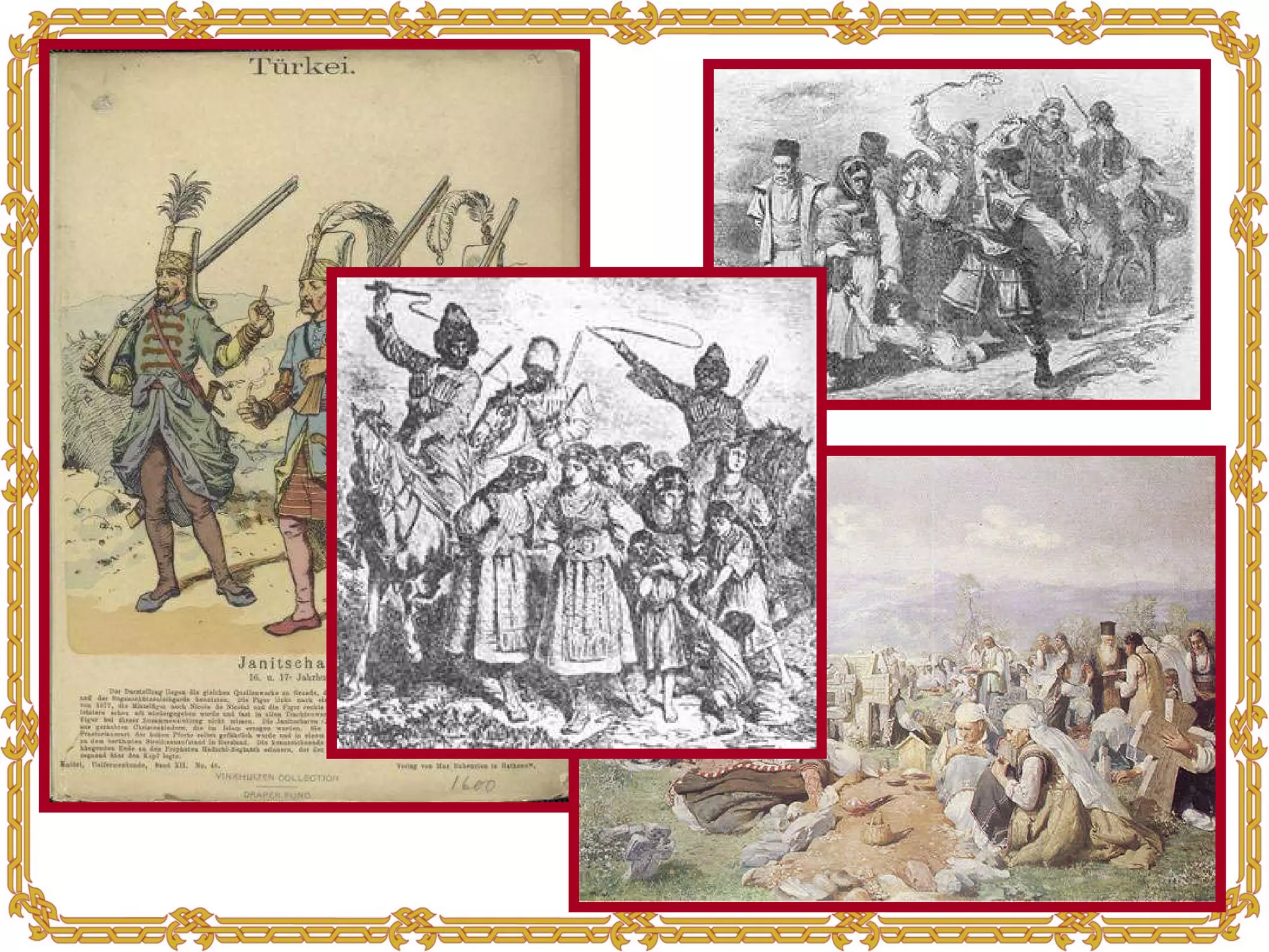 България под турскоробство Живот на българите – не носят цветни дрехи, нямат право да участват в управлението и във войската, плащат високи данъци, кръвният данък – най-зловещия от всички, целта е била да се ислямизира населението . Българите успяват да се запазят като народ благодарение на своята религия, като са спазвали нейните правила да пазят обичаите, традициите, ценностите в семействата, манастирите, народното творчество.