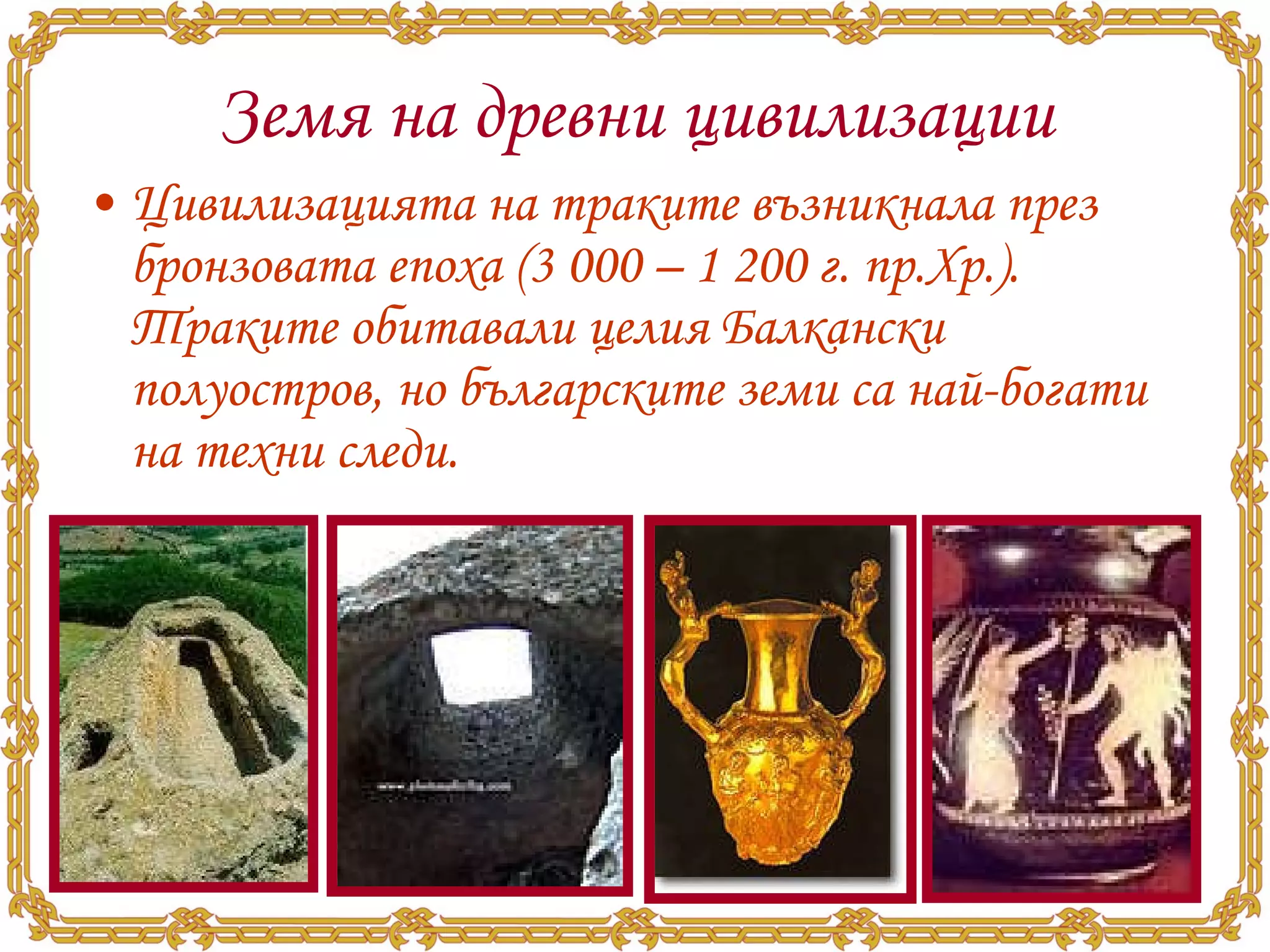 Земя на древницивилизации Цивилизацията на траките възникнала през бронзовата епоха (3 000 – 1 200 г. пр.Хр.). Траките обитавали целия Балкански полуостров, но българските земи са най-богати на техни следи.