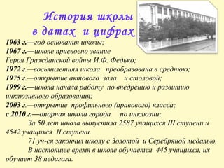Документ описывает историю и основные достижения школы с момента её основания в 1963 году, акцентируя внимание на инклюзивном образовании и социальном сопровождении учащихся. За 50 лет школа выпустила более 7000 учащихся, в том числе 71 медалиста, и активно внедряет современные методики обучения для различных категорий детей, включая учащихся с особыми образовательными потребностями. В документе представлены мероприятия по развитию учащихся, результаты олимпиад и рейтинги участия школы в внешкольных конкурсах.