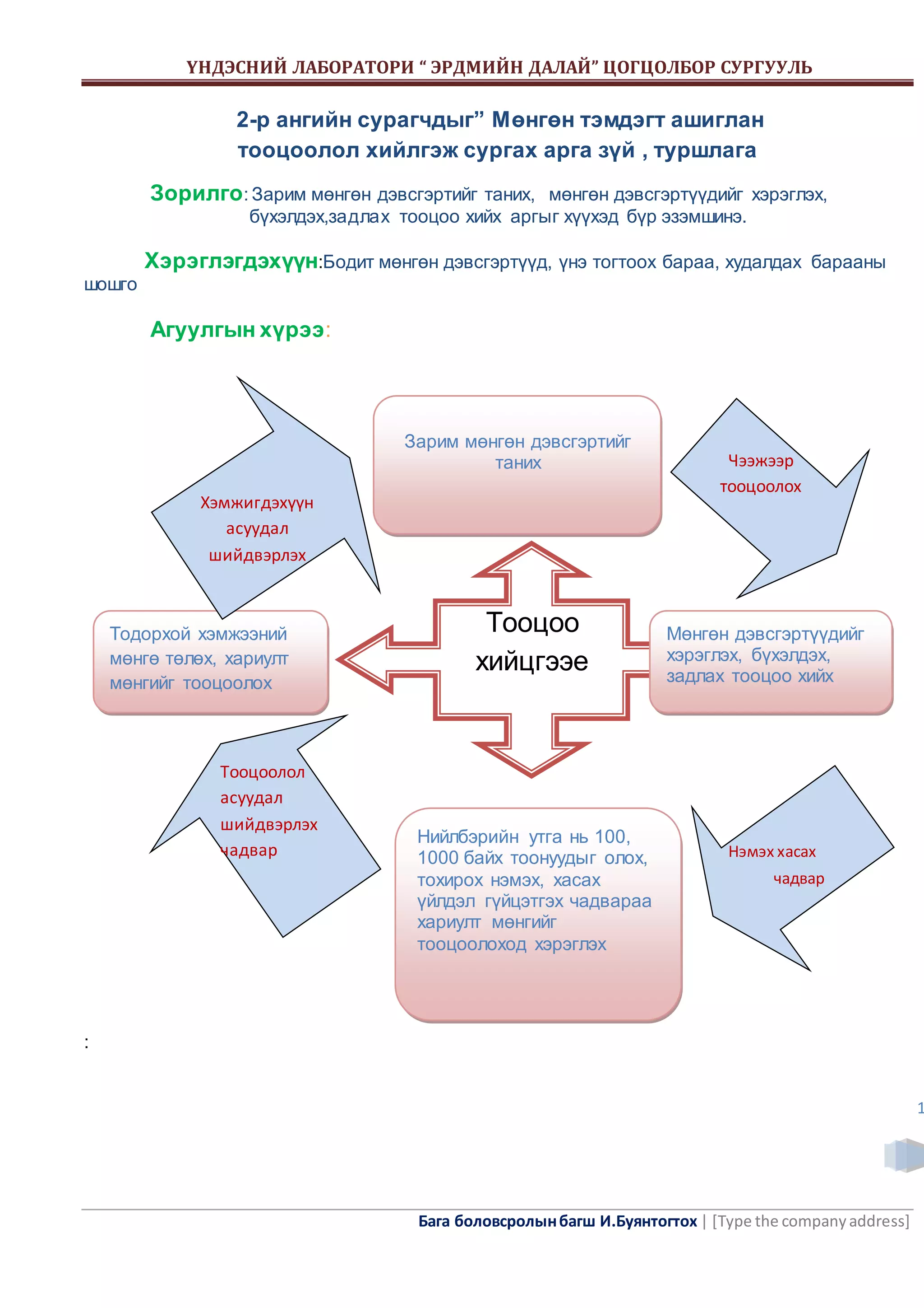 ЭРДМИЙН ДАЛАЙ” ЦОГЦОЛБОР СУРГУУЛЬ Бага боловсролын багш И.Буянтогтох | [Type the company address] 6 Тооцооллыг чээжээрээ хурдтай алдаагүй гүйцэтгэнэ. Тооны машинд тооцоололыг маш хурдтай алдаагүй гүйцэтгэнэ. Худалдах, худалдан авахдаа тооцоололоо сайн бодож байж хийнэ. Ашигтай худалдаа хийх арга зүйд сурсан байна. Бодлогуудыг олон аргаар бодно. Тайлбарыг сайн хийж сурсан байна. Худалдааны бодлогыг янз бүрийн хувилбараар өөрөө зохиож бодно. Гэрийнхээ өдрийн орлого зарлагыг тооцоолдог болсон байна. Ашигтай ба алдагтай худалдаагаагаа тайлбарлан ярьж, Яагаад? Гэсэн асуултанд хариулна. Мөнгө ашиглан “Чадваржин, дадлагажиж “ байгаа хүүхэд: Өгсөн мөнгөөр зураг харж худалдаа хийдэг болсон байна. Худалдагч болж алдаагүй худалдаа хийнэ Худалдан авагч болж юу юу авахаа төлөвлөдөг болсон байна. Өөрт өгсөн бодлогуудыг алдаагүй зөв бодож, тооцооллоо бусдад тайлбарлан ярьдаг болсон байна. Худалдааны бодлогыг дуурайн зохиож сурсан байна. Зохиосноо алдаагүй зөв боддог болсон байна. Мөнгө ашиглан “тооцоолол хийж сурч байгаа хүүхэд” Мөнгөн дэвсгэртийг таньдаг болсон байна. Мөнгөн дэвсгэртүүдийг хэрэглэх, бүхэлдэх, задлах тооцоо хийх аргыг мэддэг болсон байна Тодорхой хэмжээний мөнгө төлөх, хариулт мөнгийг тооцоолон худалдаа хийнэ. Тооцооллоо шалгах аргад суралцсан байна. / Хариулт мөнгө / Бүхэл мөнгөнд худалдаа хийж тоглоно. Тооцооллоо тайлбарлан ярьдаг болно. Багш энэ сэдвийг заахдаа дээрх зөвлөмж, арга зүйг ашиглаж заавал хүүхдүүд тооцооллыг маш сайн хийж сурна. 5-6 цагийн хичээлийн 80% нь тоглоом л тоглуулж багш судалгаа, явцын үнэлгээгээ хийнэ. Хурдтай сайн гүйцэтгэж байгаа тохиолдолд багш ялгаатай даалгаврыг боловсруулан өгч эхэлнэ. Эцсийн үнэлгээ хийхэд танай ангийн хүүхдүүдээс хөгжсөн хүүхэд олон болсон байх учиртай. Сэдэв бүрээр л хүүхдийг 3 түвшинг баримжаалан сургалтаа зохион байгуулснаар математикийн хичээлд хоцрогдол бага гарна гэдэг нь туршилтаар нотлогдсон билээ. Манай 2б ангийн 38 сурагч “ мөнгөөр тооцоолол хийж сурах” сэдвийн хүрээнд хөгусөн сурагч 27, чадваржиж дадлагажсан сурагч 11 байсан . Энэ сэдвээр эзэмсэн чадвар дадал дараагийн хичээлийн тооцоолон бодох арга зүйд шууд нөлөөтэй.