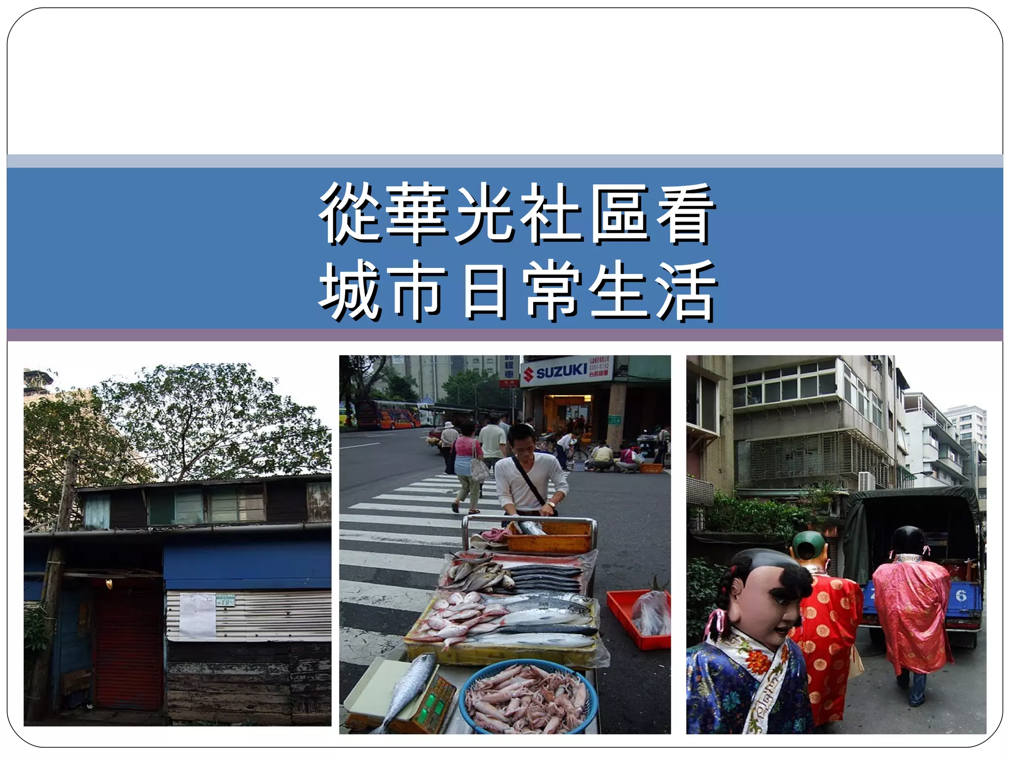 * 華光社區的特性是很有懷舊的味道,長青苔的日式建築,而且常常有阿公就穿著內衣內褲出門。 在華光社區常常會在街上看到在路旁聊天的人們,或者開門不設防的打麻將的人們 * 街坊鄰里 : 書中的概念 * 現在社區的組成有眷舍與違建,數目各為 ..