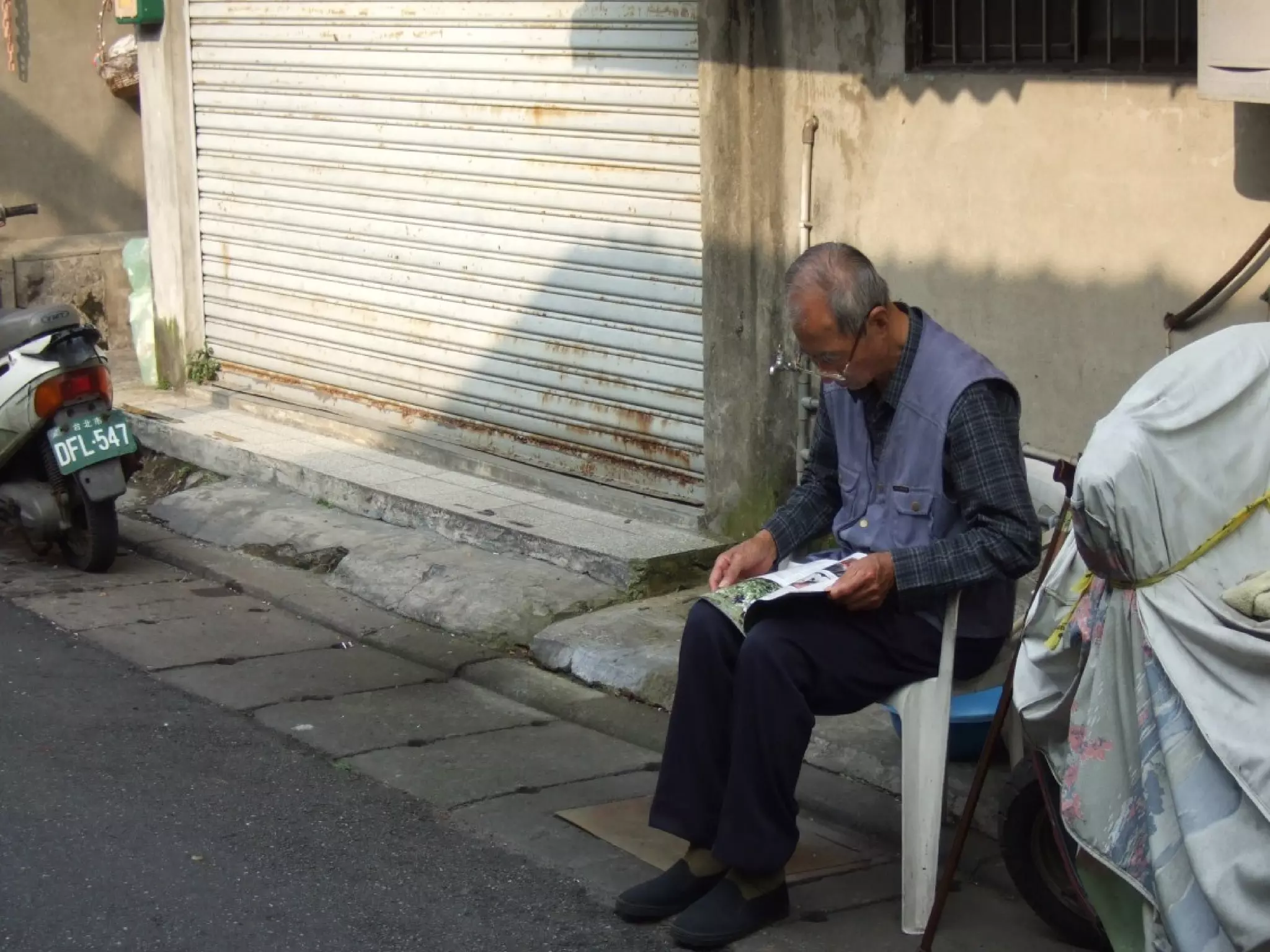阿公在路旁隨意地看書 之後陽光也不再同樣溫度