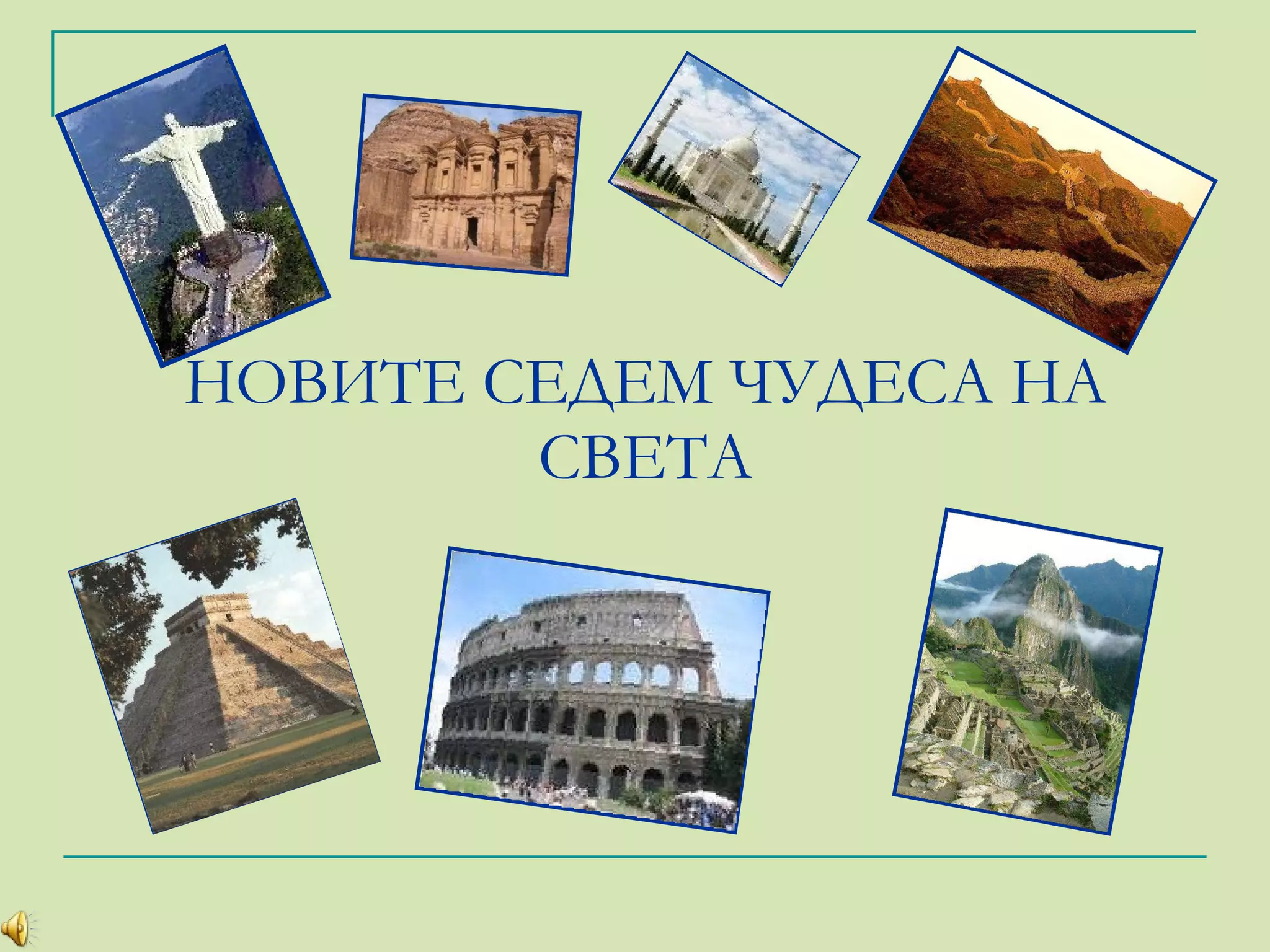 Великата Китайска стенаГрад Петра в Йордания Статуята на Христос Спасител в Бразилия Мачу Пикчу в Перу Чичен Ица в Мексико Колизеумът в Рим Тадж Махал в Индия