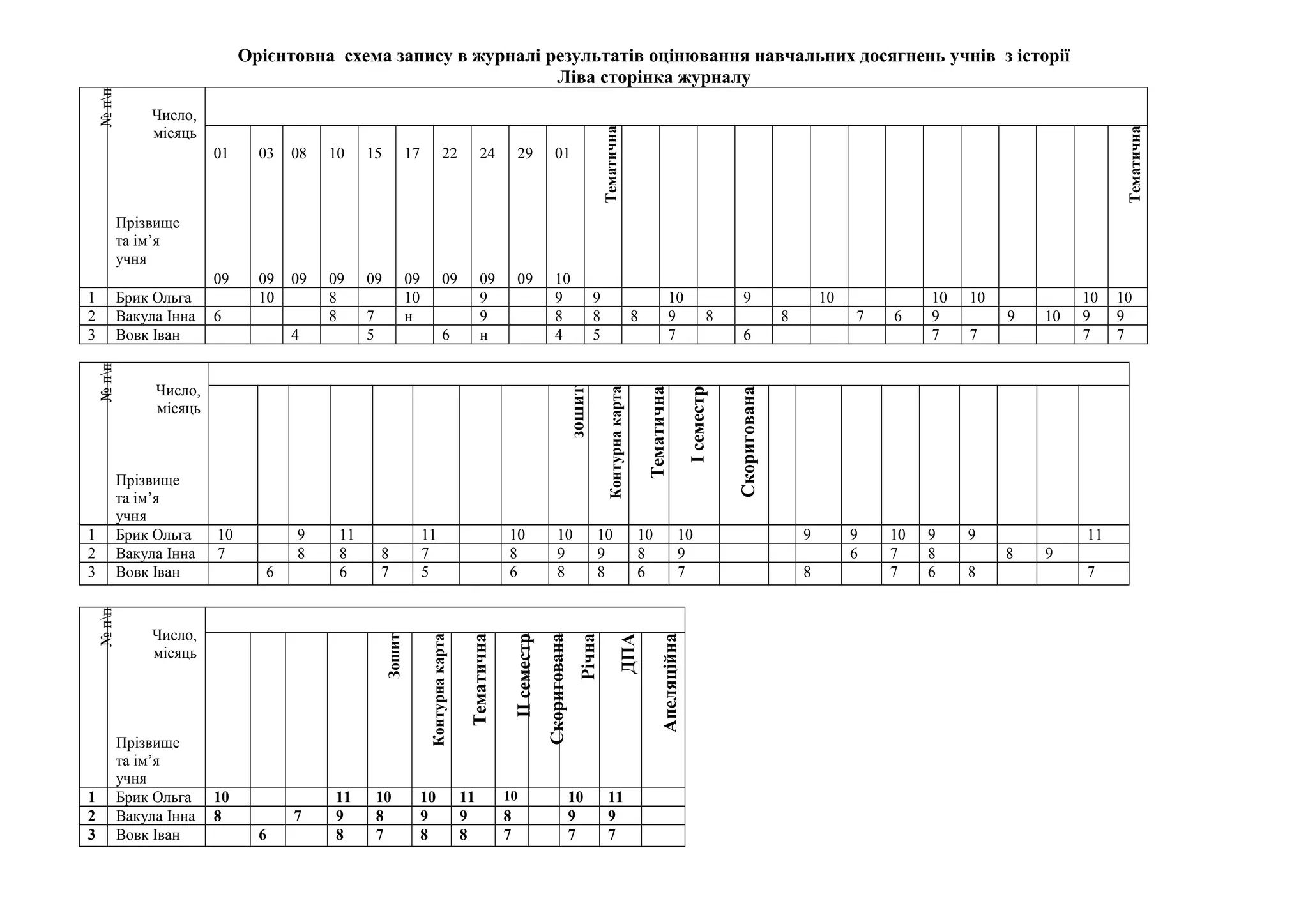 Орієнтовна схема записув журналі результатів оцінювання навчальних досягнень учнів з історії