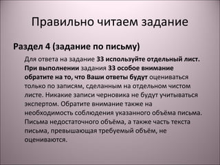 Документ содержит инструкции по написанию личного письма, включая правила оформления и критерии оценки для задания по письму на экзамене ГИА 2015 года. Особое внимание уделяется необходимости следовать заданному объему и структуре письма, а также корректному ответу на три вопроса друга-пенпала. Включены примеры оформления адреса, приветствия, основной части и заключения письма.