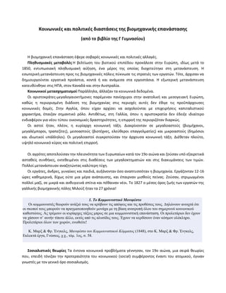 Κοινωνικές και πολιτικέςδιαστάσεις της βιομηχανικής επανάστασης (από το βιβλίο της Γ Γυμνασίου) Η βιομηχανική επανάσταση έφερε σοβαρές κοινωνικές και πολιτικές αλλαγές. Πληθυσμιακές μεταβολές Η βελτίωση του βιοτικού επιπέδου προκάλεσε στην Ευρώπη, ιδίως μετά το 1850, εντυπωσιακή πληθυσμιακή αύξηση, ένα μέρος της οποίας διοχετεύτηκε στη μετανάστευση. Η εσωτερική μετανάστευση προς τις βιομηχανικές πόλεις πύκνωσε τις στρατιές των εργατών. Τότε, άρχισαν να δημιουργούνται εργατικά προάστια, κοντά ή και ανάμεσα στα εργοστάσια. Η εξωτερική μετανάστευση κατευθύνθηκε στις ΗΠΑ, στον Καναδά και στην Αυστραλία. Κοινωνικοί μετασχηματισμοί Παράλληλα, άλλαζαν τα κοινωνικά δεδομένα. Οι αριστοκράτες-μεγαλογαιοκτήμονες παρέμεναν πανίσχυροι στην ανατολική και μεσογειακή Ευρώπη, καθώς η περιορισμένη διάδοση της βιομηχανίας στις περιοχές αυτές δεν έθιγε τις προΰπάρχουσες κοινωνικές δομές. Στην Αγγλία, όπου είχαν αρχίσει να ασχολούνται με επιχειρήσεις καπιταλιστικού χαρακτήρα, έπαιζαν σημαντικό ρόλο. Αντιθέτως, στη Γαλλία, όπου η αριστοκρατία δεν έδειξε ιδιαίτερο ενδιαφέρον για νέου τύπου οικονομικές δραστηριότητες, η επιρροή της περιοριζόταν διαρκώς. Οι αστοί ήταν, πλέον, η κυρίαρχη κοινωνική τάξη. Διακρίνονταν σε μεγαλοαστούς (βιομήχανοι, μεγαλέμποροι, τραπεζίτες), μεσοαστούς (βιοτέχνες, ελεύθεροι επαγγελματίες) και μικροαστούς (δημόσιοι και ιδιωτικοί υπάλληλοι). Οι μεγαλοαστοί συγκροτούσαν την άρχουσα κοινωνική τάξη. Διέθεταν πλούτο, υψηλό κοινωνικό κύρος και πολιτική επιρροή. Οι αγρότες αποτελούσαν την πλειονότητα των Ευρωπαίων κατά τον 19ο αιώνα και ζούσαν υπό εξαιρετικά ασταθείς συνθήκες, εκτεθειμένοι στις διαθέσεις των μεγαλοκτηματιών και στις διακυμάνσεις των τιμών. Πολλοί μετανάστευαν αναζητώντας καλύτερη τύχη. Οι εργάτες, άνδρες, γυναίκες και παιδιά, αυξάνονταν όσο αναπτυσσόταν η βιομηχανία. Εργάζονταν 12-16 ώρες καθημερινά, δίχως ούτε μια μέρα ανάπαυσης, και έπαιρναν μισθούς πείνας. Ζούσαν, στριμωγμένοι πολλοί μαζί, σε μικρά και ανθυγιεινά σπίτια και πέθαιναν νέοι. Το 1827 ο μέσος όρος ζωής των εργατών της γαλλικής βιομηχανικής πόλης Μιλούζ ήταν τα 27 χρόνια! 1. Το Κομμουνιστικό Μανιφέστο Οι κομμουνιστές θεωρούν ανάξιό τους να κρύβουν τις απόψεις και τις προθέσεις τους. Δηλώνουν ανοιχτά ότι οι σκοποί τους μπορούν να πραγματοποιηθούν μονάχα με τη βίαιη ανατροπή όλου του σημερινού κοινωνικού καθεστώτος. Ας τρέμουν οι κυρίαρχες τάξεις μπρος σε μια κομμουνιστική επανάσταση. Οι προλετάριοι δεν έχουν να χάσουν σ’ αυτήν τίποτε άλλο, εκτός από τις αλυσίδες τους. Έχουν να κερδίσουν έναν κόσμον ολόκληρο. Προλετάριοι όλων των χωρών, ενωθείτε! Κ. Μαρξ & Φρ. Ένγκελς, Μανιφέστο του Κομμουνιστικού Κόμματος (1848), στο Κ. Μαρξ & Φρ. Ένγκελς, Εκλεκτά έργα, Γνώσεις, χ.χ., τόμ. 1ος, σ. 58. Σοσιαλιστικές θεωρίες Τα έντονα κοινωνικά προβλήματα γέννησαν, τον 19ο αιώνα, μια σειρά θεωρίες που, επειδή τόνιζαν την προτεραιότητα του κοινωνικού (social) συμφέροντος έναντι του ατομικού, έγιναν γνωστές με τον γενικό όρο σοσιαλισμός.