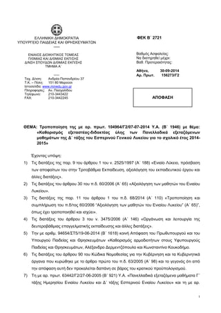 ΘΕΜΑ: Τροποποίηση της με αρ. πρωτ. 104964/Γ2/07-07-2014 Υ.Α. (Β΄ 1946) με θέμα: «Καθορισμός εξεταστέας-διδακτέας ύλης των Πανελλαδικά εξεταζόμενων μαθημάτων της Δ΄ τάξης του Εσπερινού Γενικού Λυκείου για το σχολικό έτος 2014- 2015»