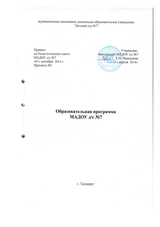 Документ представляет собой основную образовательную программу дошкольного образования для детского сада №7, описывающую цели, задачи и методы работы учреждения. Программа включает в себя возрастные характеристики детей, а также приоритетные направления образовательного процесса в различных областях развития. Основное внимание уделяется всестороннему формированию личности ребенка, учетом его индивидуальных особенностей и необходимости сотрудничества с семьями.
