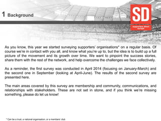 The April-May 2014 survey of supporters' organisations reveals a growing movement, with a 30% increase in membership and significant engagement in events and communications. Despite some relationship dips with football and political stakeholders, there have been notable improvements in meeting frequencies and online interactions. Overall, the data indicates positive trends and plans for biannual surveys to enhance future insights.