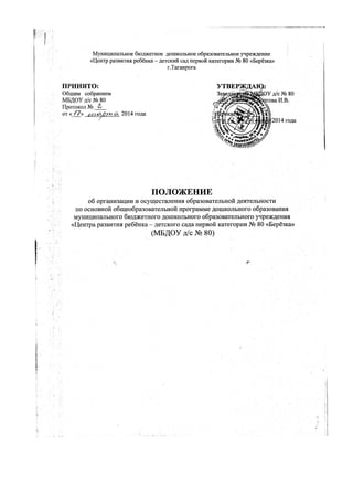 Настоящее положение регулирует организацию образовательной деятельности по основной программе дошкольного образования в МБДОУ Д/С № 80, в соответствии с российским законодательством. Оно включает правила комплектования детей, формы обучения и организацию образовательного процесса, а также порядок зачисления и отчисления обучающихся. Договор между учреждением и родителями регулирует отношения и ответственность сторон в ходе обучения ребенка.