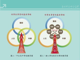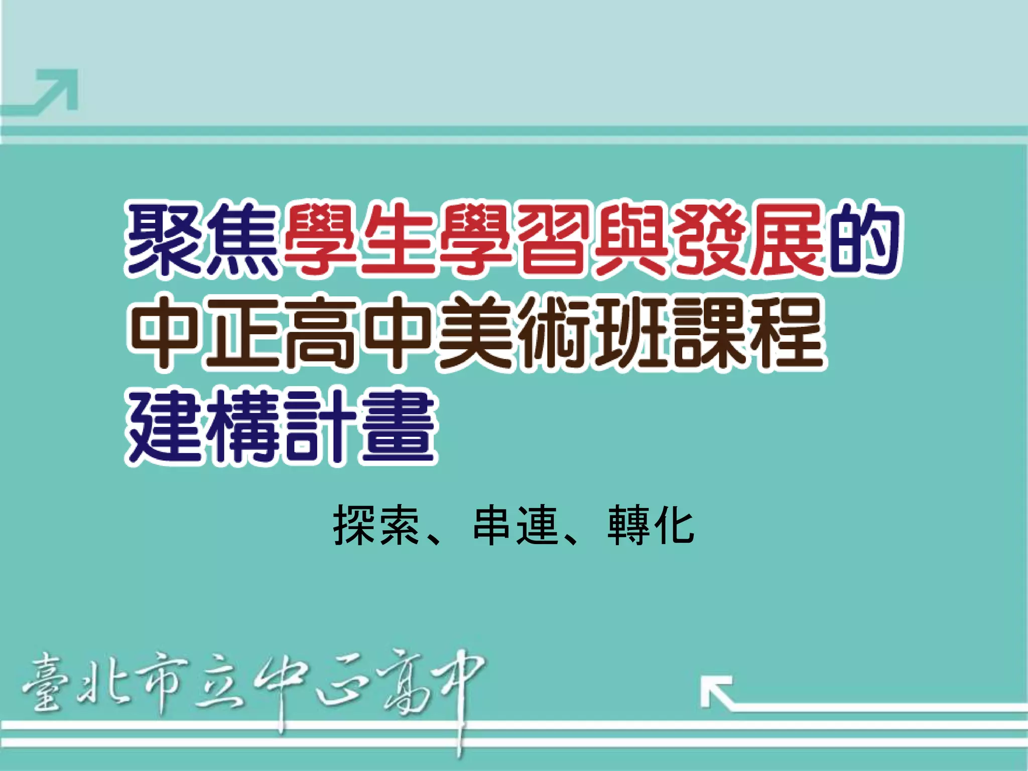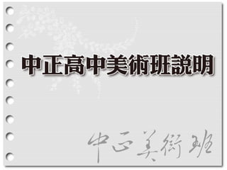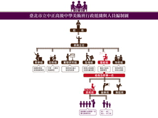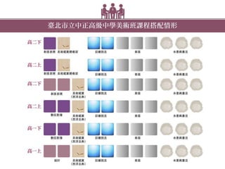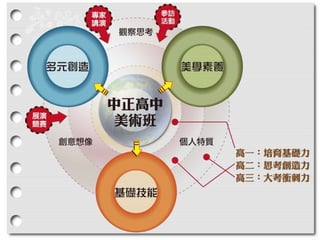 - 中正美術班成班簡介… - 行政與管理:本校美術班行政組織 - 師資與研究:專、兼任及課程配置 - 課程與教學:本班課程總體規劃 - 經費與設備 - 成果與特色 - 教學課程再建構... - 美術班課程TOWS分析 - 美術班課程活化