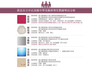 行政教師:蔡紫德(設計、創意表現) 專任教師:陳裕發(水墨、書法) 李雅妍(素描、藝術鑑賞<西>) 李景龍(彩繪技法) 黃省非(藝術鑑賞<中>) 兼任教師:鍾松杰(數位影像):專業電繪設計師 劉碧旭(高三藝術鑑賞):實踐大學講師、策展人 分機251