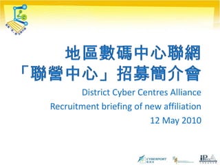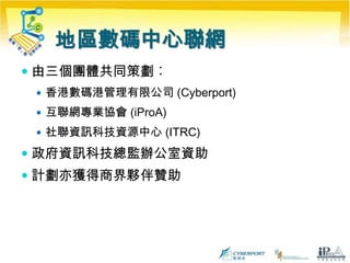 地區數碼中心聯網旨在透過商業、政府和社會三方合作,提升社區的數碼技能。在2010年之前,該計劃已成功建立33間聯營中心,服務超過35,000人,並獲得逾港幣2,000萬的捐助。計劃包括能力提升方案、數碼社區獎勵及流動電腦館等,致力於消除數碼鴻溝,促進資訊科技的應用與教育。