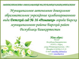 Детский сад № 16 «Ромашка» в Бирске работает более 34 лет и обслуживает более 300 детей в возрасте от 1,5 до 7 лет. Учебный процесс включает 12 групп, коррекционные занятия для детей с нарушениями речи и зрения, а также работу с опытными педагогами в различных областях. Детский сад активно ведет научную работу и сотрудничает с образовательными учреждениями и медицинскими организациями для обеспечения комплексного развития детей.