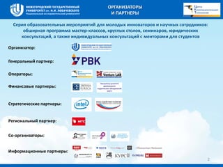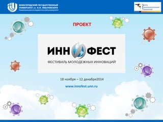 Документ описывает фестиваль инноваторов, прошедший с 18 ноября по 12 декабря 2014 года, который включает образовательные мероприятия, мастер-классы, деловые игры и выставки для молодых ученых. Основные цели фестиваля включают формирование молодежной инновационной среды, развитие компетенций и поддержку перспективных идей научной молодежи. Ожидается участие 1,000 человек и более 60 призеров, а также создание 30 инновационных проектов.