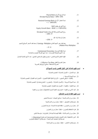 يستعرض المستند النسب المالية المستخدمة في التحليل المالي، بما في ذلك نسب الربحية، نسب السيولة، ونسب تقييم كفاءة الأرباح والسيولة. كما يتناول أيضًا معايير تحليل التعادل وقياس الرفع المالي والتشغيلي. تحتوي الوثيقة على معادلات وإيضاحات دقيقة تؤكد على أهمية هذه النسب في تقييم الوضع المالي للشركة.