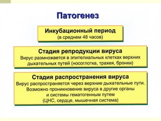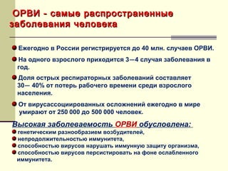 Документ представляет собой обзор острых респираторных вирусных инфекций (ОРВИ) и гриппа, включая статистические данные о заболеваемости, осложнениях и факторах риска. Описаны клинические характеристики, методы диагностики, а также рекомендации по лечению и профилактике, включая вакцинацию. Важность своевременной диагностики и лечения подчеркивается для предотвращения тяжёлых осложнений.
