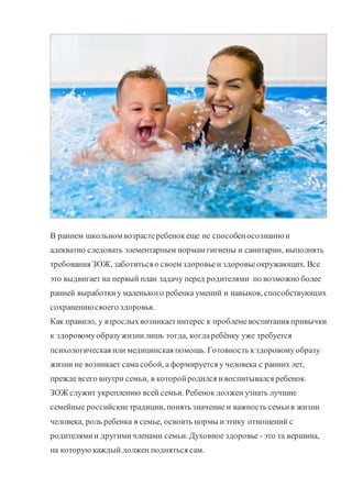 Документ подчеркивает важность сохранения и укрепления здоровья с раннего возраста, акцентируя на роли семьи и воспитания. Он описывает основные навыки и знания, которые родители должны привить детям для формирования здорового образа жизни. Также отмечается необходимость единой программы гигиенического обучения в семье и детском саду для эффективного оздоровления детей.