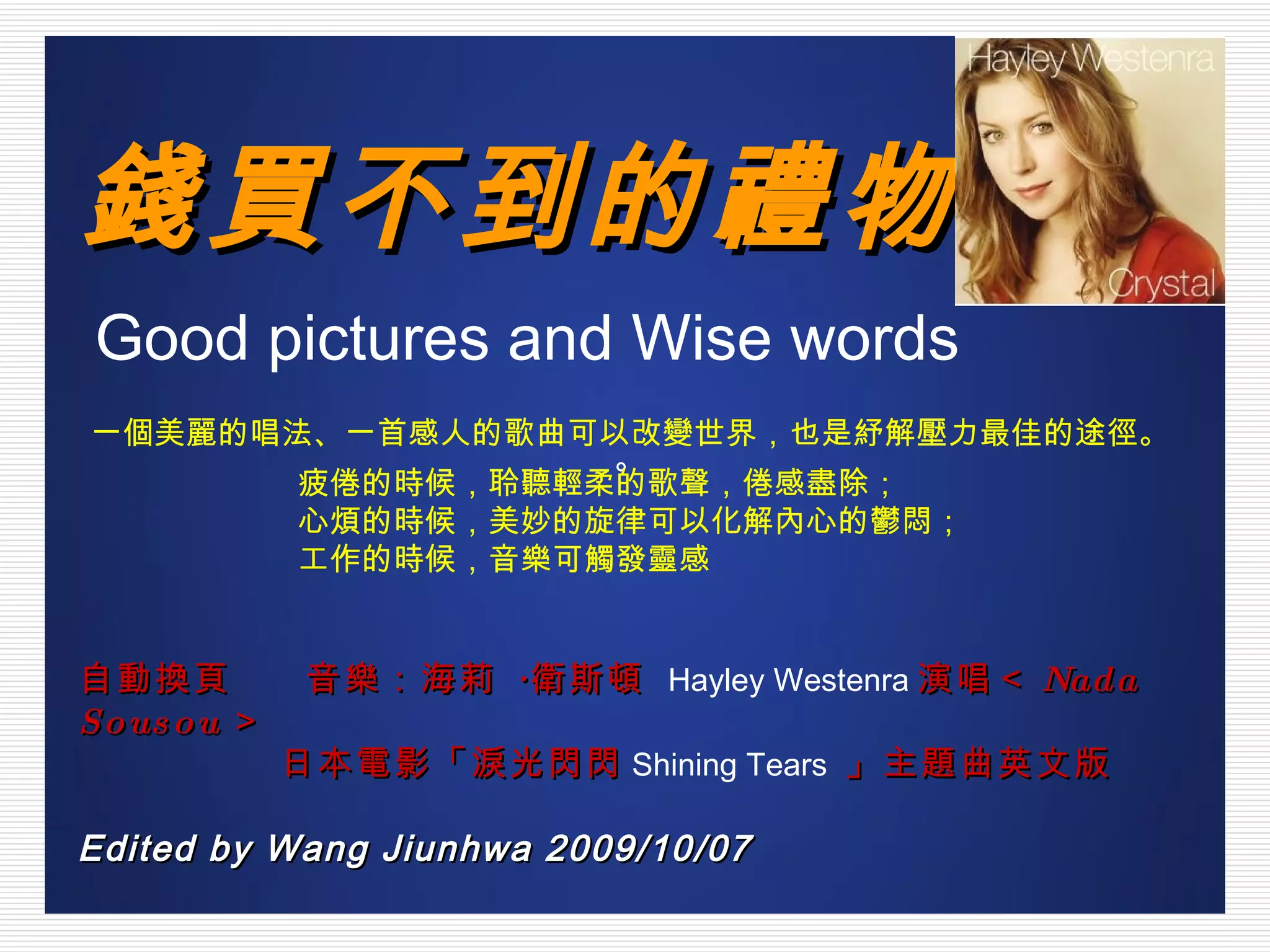 錢買不到的禮物 自動換頁 音樂:海莉 · 衛斯頓 Hayley Westenra 演唱< Nada Sousou > 日本電影「淚光閃閃 Shining Tears 」主題曲英文版 Edited by Wang Jiunhwa 2009/10/07 Good pictures and Wise words 。 。 一個美麗的唱法、一首感人的歌曲可以改變世界,也是紓解壓力最佳的途徑。 疲倦的時候,聆聽輕柔的歌聲,倦感盡除; 心煩的時候,美妙的旋律可以化解內心的鬱悶; 工作的時候,音樂可觸發靈感