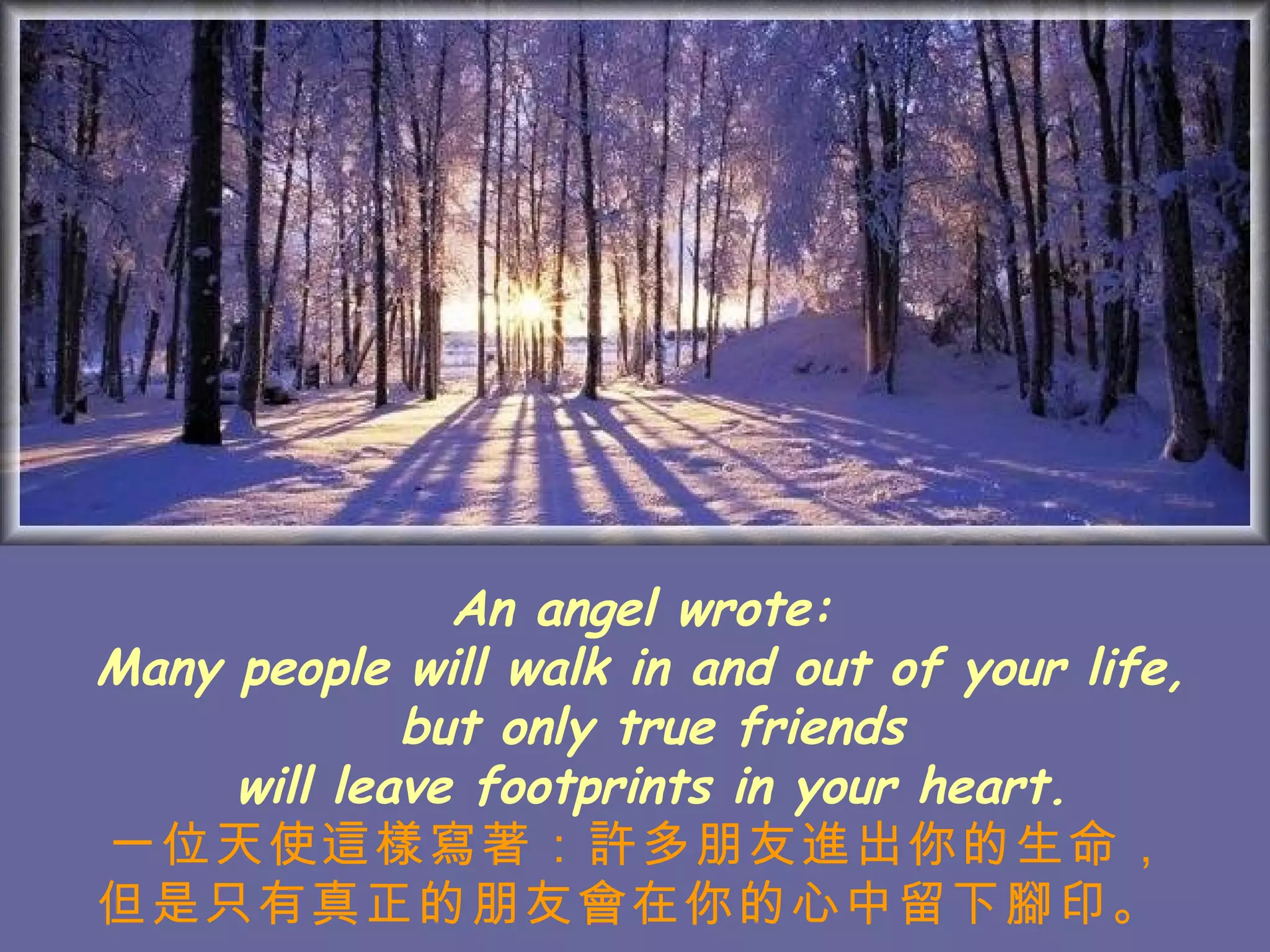 An angel wrote:Many people will walk in and out of your life, but only true friends will leave footprints in your heart. 一位天使這樣寫著:許多朋友進出你的生命, 但是只有真正的朋友會在你的心中留下腳印。