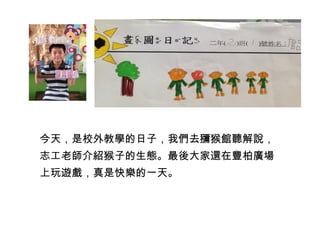 今天,是校外教學的日子,我們去獼猴館聽解說, 志工老師介紹猴子的生態。最後大家還在豐柏廣場 上玩遊戲,真是快樂的一天。