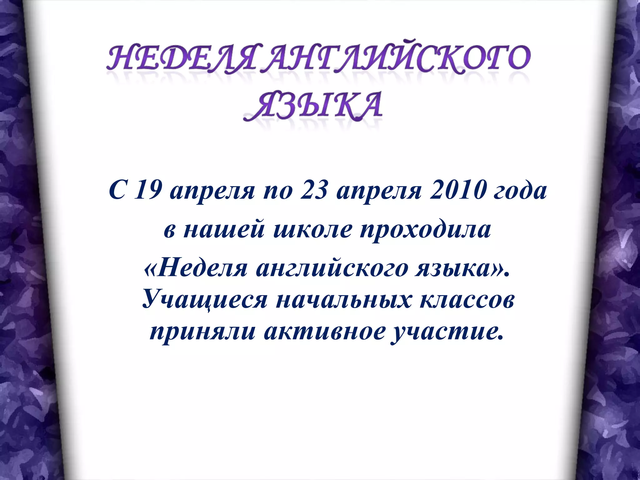 С 19 по 23 апреля 2010 года в школе прошла неделя английского языка с участием учащихся начальных классов. В ходе мероприятий были проведены интерактивные игры, чтение стихотворений и подготовка презентаций, а также школьная олимпиада. Результаты соревнований среди классов включают призовые места для нескольких участников.