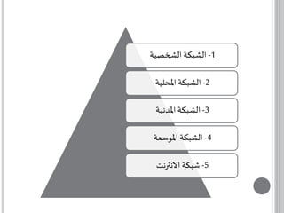 تناقش الوثيقة أنواع شبكات الحاسب، بما في ذلك الشبكة الشخصية والمحلية والمدنية والموسعة، بالإضافة إلى شبكة الإنترنت. كل نوع له ميزاته واستخداماته الخاصة، مع تحديد نطاقات المساحة وإدارة الشبكات. تُستخدم الشبكات المختلفة لتوفير الاتصال والبيانات بين الأجهزة في سياقات متنوعة، من التوصيلات الشخصية إلى الربط بين مدن ودول.