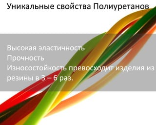 Документ описывает уникальные свойства полиуретанов, подчеркивая их высокую эластичность, прочность и износостойкость, что позволяет им заменять резину в различных применениях. Он также перечисляет оптимальные условия применения полиуретанов и преимущества их использования в футеровке, скребках, роликах и уплотнительных манжетах. Технические характеристики, такие как температура эксплуатации и твердость, подчеркивают долговечность и эффективность полиуретановых изделий в различных областях.