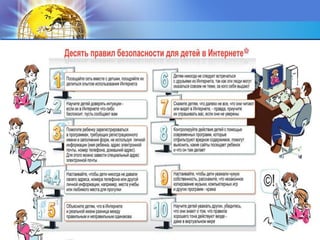 Документ предоставляет рекомендации по безопасному использованию интернета, подчеркивая важность защиты личной информации и соблюдения правил безопасности. Описываются основные угрозы, такие как вирусы, спам и интернет-мошенничество, а также даны советы по безопасному общению в сети, особенно для детей. Важным аспектом является напоминание о юридической ответственности и необходимости соблюдения авторских прав в интернете.