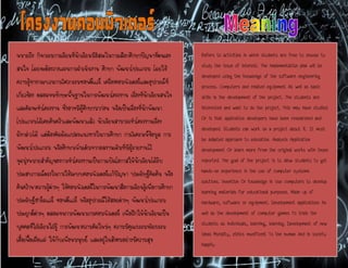 Refers to activities in which students are free to choose to study the issue of interest. The implementation plan will be developed using the knowledge of the software engineering process. Computers and related equipment As well as basic skills in the development of the project. The students are interested and want to do the project. This may have studied. Or is that application developers have been researched and developed. Students can work on a project about it. It must be adapted approach to education. Analysis Application development Or learn more from the original works with those reported. The goal of the project is to allow students to get hands-on experience in the use of computer systems solutions. invention Or knowledge in Use computers to develop learning materials for educational purposes. Made up of hardware, software or equipment. Development applications As well as the development of computer games To train the students as individuals, learning, learning. Development of new ideas Morality, ethics munificent To the human And in society happily.