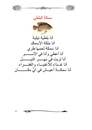 تتحدث الوثيقة عن تربية أسماك البلطي وأنواعها وأساليب إنشاء المزارع السمكية، حيث تفصل في مراحل وإنشاء الأحواض وتغذية ورعاية الأسماك، وكذلك دراسة جدوى المشروع ومتطلبات النجاح. كما تستعرض المفاهيم الأساسية المتعلقة بتفريخ الأسماك وأمراضها وطرق علاجها. يحتوي الكتاب على معلومات شاملة تدعم الإنتاج السمكي وتحقيق أفضل النتائج.