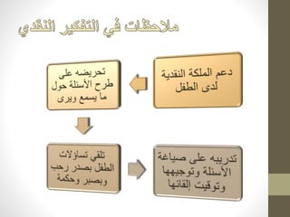 يتناول المستند أنواع التفكير المختلفة مثل التفكير الإبداعي والتحليلي والموضوعي وكيفية تطويرها لدى الأطفال. يركز على أهمية إدراك الأطفال لذكائهم وأفكارهم، ويقدم نصائح لتعزيز التفكير الإيجابي والنقدي. كما يؤكد على أهمية التواصل الصادق مع الأطفال حول الحقائق الواقعية لتطوير مهاراتهم الفكرية.
