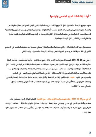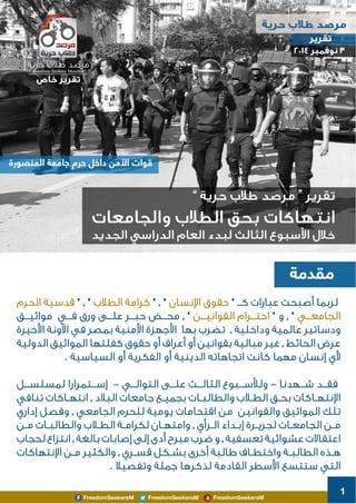 شملت أحداث الأسبوع الثالث من العام الدراسي الجديد في الجامعات المصرية اقتحامات متكررة لحرم الجامعات من قبل قوات الأمن، مما أدى إلى اعتقالات تعسفية وإصابات بين الطلاب. شهدت عدة جامعات مثل الأزهر وعين شمس والمنصورة أعمال عنف شديدة مع استخدام الغاز المسيل للدموع والأسلحة النارية، بالإضافة إلى استخدام تعسفي للقوة واعتقالات عشوائية. تعكس هذه الأحداث سياسة القمع والاعتداء على الحقوق والحريات في مصر، مما يزيد من تفشي الانتهاكات بحق الطلاب.