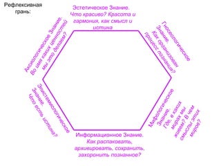 Документ исследует различные формы знания, включая эстетическое, аксиологическое и гносеологическое, и размышляет о том, как они соотносятся с человеческим опытом и существованием. Главная тема заключается в понимании красоты, гармонии и значения 'не-я' в контексте культуры и социосистемы. Эстетика рассматривается как способ познания, который стремится улавливать и интегрировать человеческие чувства и восприятия в рамках сложных противоречий.