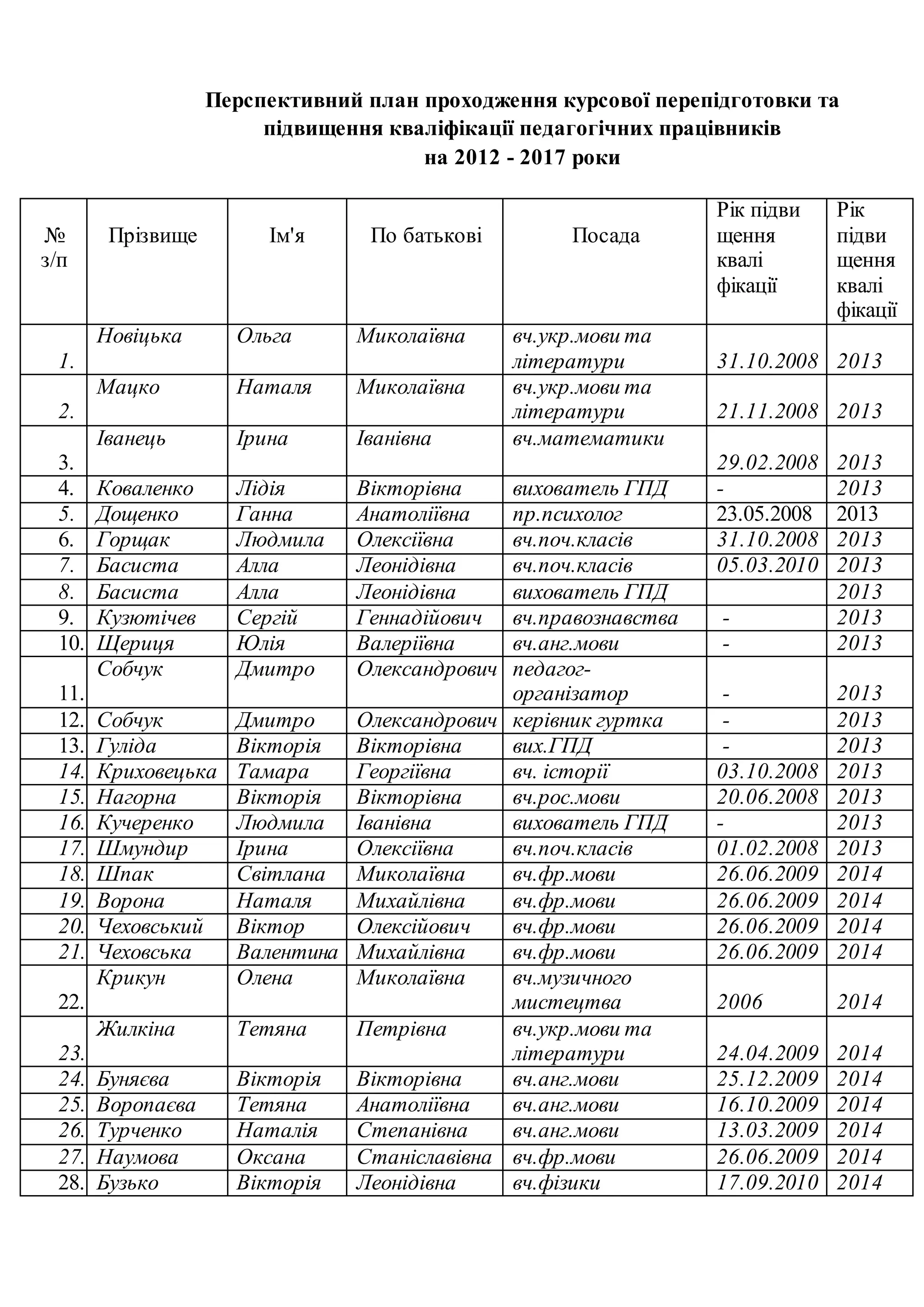 курсової перепідготовки та підвищення кваліфікації педагогічних працівників на 2012 - 2017 роки № з/п Прізвище Ім'я По батькові Посада Рік підви щення квалі фікації Рік підви щення квалі фікації 1. Новіцька Ольга Миколаївна вч.укр.мови та літератури 31.10.2008 2013 2. Мацко Наталя Миколаївна вч.укр.мови та літератури 21.11.2008 2013 3. Іванець Ірина Іванівна вч.математики 29.02.2008 2013 4. Коваленко Лідія Вікторівна вихователь ГПД - 2013 5. Дощенко Ганна Анатоліївна пр.психолог 23.05.2008 2013 6. Горщак Людмила Олексіївна вч.поч.класів 31.10.2008 2013 7. Басиста Алла Леонідівна вч.поч.класів 05.03.2010 2013 8. Басиста Алла Леонідівна вихователь ГПД 2013 9. Кузютічев Сергій Геннадійович вч.правознавства - 2013 10. Щериця Юлія Валеріївна вч.анг.мови - 2013 11. Собчук Дмитро Олександрович педагог- організатор - 2013 12. Собчук Дмитро Олександрович керівник гуртка - 2013 13. Гуліда Вікторія Вікторівна вих.ГПД - 2013 14. Криховецька Тамара Георгіївна вч. історії 03.10.2008 2013 15. Нагорна Вікторія Вікторівна вч.рос.мови 20.06.2008 2013 16. Кучеренко Людмила Іванівна вихователь ГПД - 2013 17. Шмундир Ірина Олексіївна вч.поч.класів 01.02.2008 2013 18. Шпак Світлана Миколаївна вч.фр.мови 26.06.2009 2014 19. Ворона Наталя Михайлівна вч.фр.мови 26.06.2009 2014 20. Чеховський Віктор Олексійович вч.фр.мови 26.06.2009 2014 21. Чеховська Валентина Михайлівна вч.фр.мови 26.06.2009 2014 22. Крикун Олена Миколаївна вч.музичного мистецтва 2006 2014 23. Жилкіна Тетяна Петрівна вч.укр.мови та літератури 24.04.2009 2014 24. Буняєва Вікторія Вікторівна вч.анг.мови 25.12.2009 2014 25. Воропаєва Тетяна Анатоліївна вч.анг.мови 16.10.2009 2014 26. Турченко Наталія Степанівна вч.анг.мови 13.03.2009 2014 27. Наумова Оксана Станіславівна вч.фр.мови 26.06.2009 2014 28. Бузько Вікторія Леонідівна вч.фізики 17.09.2010 2014