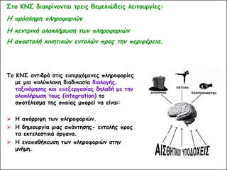 Στο ΚΝΣ διακρίνονταιτρεις θεμελιώδεις λειτουργίες: Η πρόσληψη πληροφοριών Η κεντρική ολοκλήρωση των πληροφοριών Η αποστολή κινητικών εντολών προς την περιφέρεια.