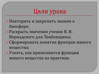 Документ содержит план урока о функциях живого вещества в биосфере, акцентируя внимание на значении учения В.И. Вернадского. Он включает методы обучения, такие как групповые задания и обсуждения, а также конкретные темы для изучения, например, влияние живых организмов на среду обитания. Также присутствуют тестовые задания для закрепления знаний учащихся.