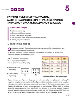 Á 5 39 ÅËÅÃ×ÏÓ ÓÕÍÅ×ÅÉÁÓ ÔÕËÉÃÌÁÔÙÍ, ÌÅÔÑÇÓÇ ÌÏÍÙÓÇÓ ÊÉÍÇÔÇÑÁ ÁÓÕÃ×ÑÏÍÏÕ ÔÑÉÖÁÓÉÊÏÕ ÂÑÁ×ÕÊÕÊËÙÌÅÍÏÕ ÄÑÏÌÅÁ Äéäáêôéêïß Óôü÷ïé Ç áðüêôçóç éêáíüôçôáò: á. Óôïí ôñüðï óýíäåóçò ïñãÜíùí â. Óôïõò áðáéôïýìåíïõò ÷åéñéóìïýò ã. Óôç ëÞøç ôéìþí ãéá ôç ìÝôñçóç ôçò áíôßóôáóçò ìüíùóçò ä. Óôçí áîéïëüãçóç ôùí äïêéìþí É. ÈÅÙÑÇÔÉÊÏ ÌÅÑÏÓ Ïé ôñéöáóéêïß êéíçôÞñåò âñá÷õêõêëùìÝíïõ äñïìÝá öÝñïõí óõíÞèùò ôñßá ôõëßãìáôá. ÁõôÜ ôïðïèåôïýíôáé óôïí óôÜôç ôïõ êéíçôÞñá. Ôá Üêñá ôùí ôõëéãìÜôùí ôïõ óôÜôç êáôáëÞãïõí óôçí ðéíáêßäá ôïõ êéíçôÞñá. Ôá óýìâïëá ôùí ôõëéãìÜôùí öáßíïíôáé óôïí ðáñáêÜôù ðßíáêá. VDE Ü ÃåñìáíéêÝò ðñïäéáãñáöÝò BS Ü ÁããëéêÝò ðñïäéáãñáöÝò ASA Ü ÁìåñéêÜíéêåò ðñïäéáãñáöÝò (á) (â) (á) Ìå óõíäåäåìÝíïõò áêñïäÝêôåò. (â) Ìå åëåýèåñïõò áêñïäÝêôåò VDE BS ASA UVW ABC T1T2T3 V-Y B2-B1 T2-T5 U-X A2A1 T1-T4 W-Z C2-C1 T3-T6 Êáôçãïñßá ÖÜóåùò 1ï Ôýëéãìá 2ï Ôýëéãìá 3ï Ôýëéãìá Óýìâïëá áêñïäåêôþí ÇëåêôñïêéíçôÞñùí Ç ùìéêÞ áíôßóôáóç ôùí ôõëéãìÜôùí åíüò ôñéöáóéêïý êéíçôÞñá ðáñïõóéÜæåé óôçí ðñÜîç ìéêñÝò áðïêëßóåéò. Ïé áãùãïß ôùí ôõëéãìÜôùí åßíáé ìïíùìÝíïé ìå åéäéêü âåñíßêé. ÁíÜìåóá óôá áõëÜêéá ôïõ óôÜôç êáé ôùí ôõëéãìÜôùí õðÜñ÷åé ìïíùôéêü ÷áñôß, ðïõ ðñïóôáôåýåé ôïõò áãùãïýò ôùí ôõëéãìÜôùí. Ç áíôßóôáóç ìüíùóçò áíÜìåóá óôïõò áãùãïýò ôõëéãìÜôùí êáé ôïõ óôÜôç ôïõ êéíçôÞñá ðñÝðåé íá Ý÷åé ôéìÞ Üðåéñç. ÐïëëÝò öïñÝò ïé óõíèÞêåò ëåéôïõñãßáò ôùí êéíçôÞñùí åßíáé ôÝôïéåò ðïõ ïäçãïýí óôçí åëÜôôùóç ôçò áíôßóôáóçò ìüíùóçò. Ç åëÜ÷éóôç áíôßóôáóç ìüíùóçò óýìöùíá ìå ôïõò êáíïíéóìïýò, Üñèñï 304, åßíáé 0,5 ÌÙ ãéá ôÜóç 250V Ýíáíôé ãçò ìÝóá óå îçñïýò ÷þñïõò êáé 0,25 ÌÙ ãéá ôÜóåéò ðÜíù áðü 250V ìÝóá óå âñåãìÝíïõò ÷þñïõò.
